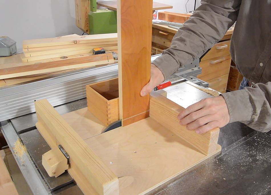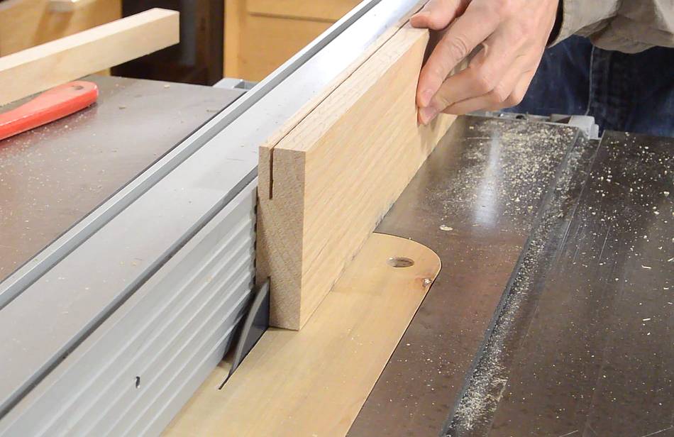 Cutting the rabbets for the drawer fronts, with two cuts on the table