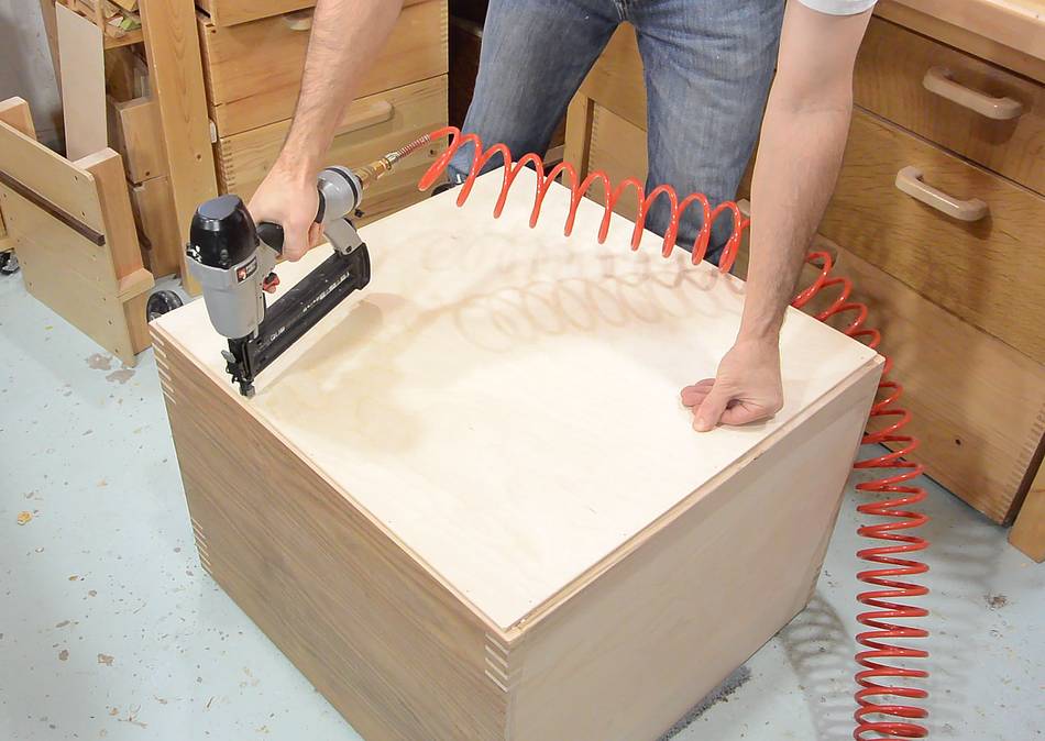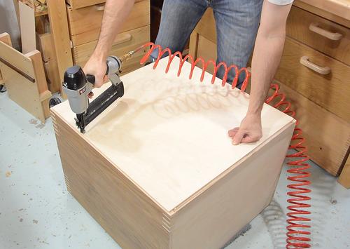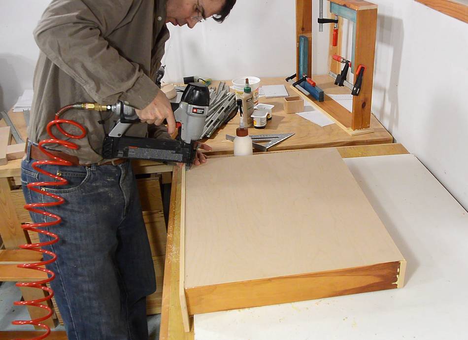 Brad nailing the drawer bottoms on with 1" brad nails. These are not