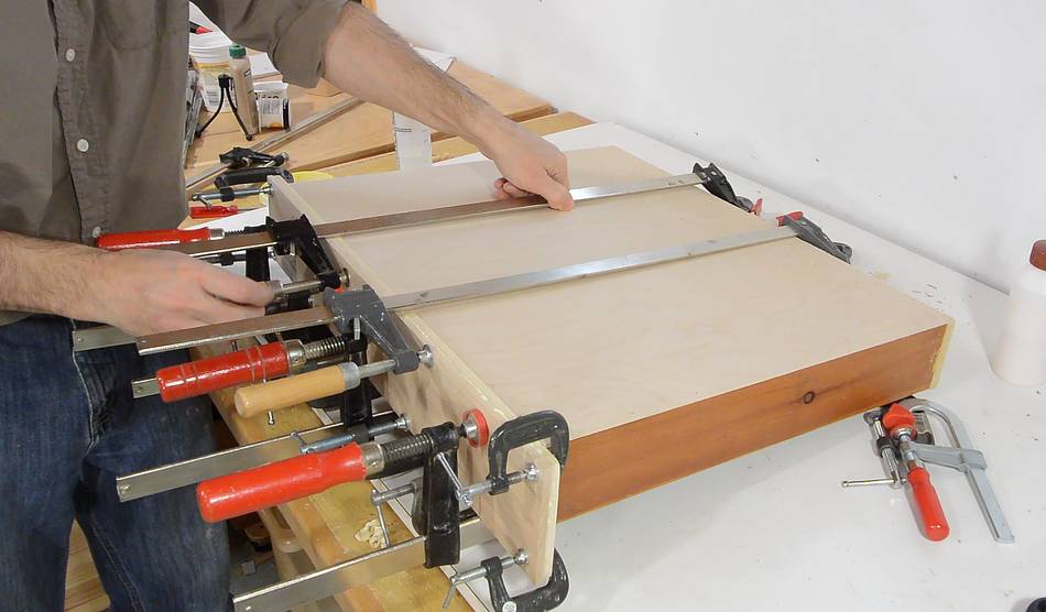 I applied glue to the drawer front and the veneer, then used a lot of clamps