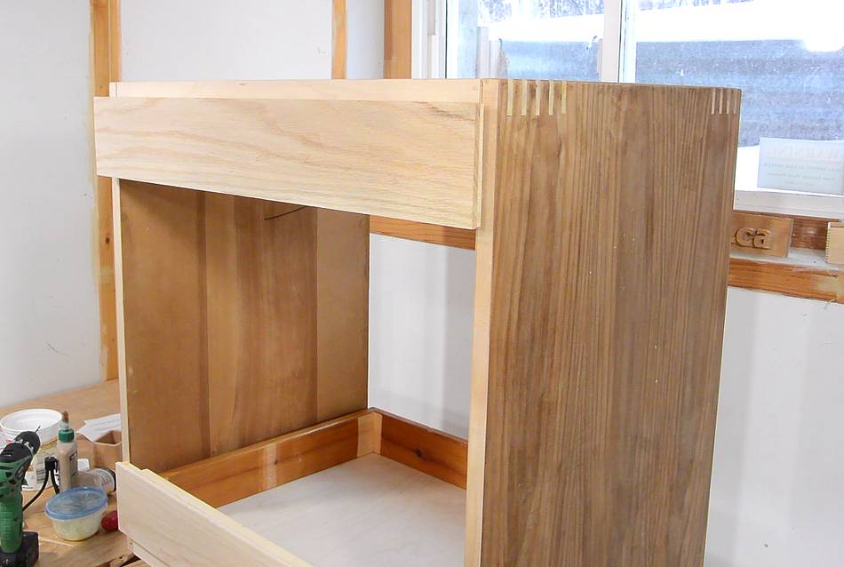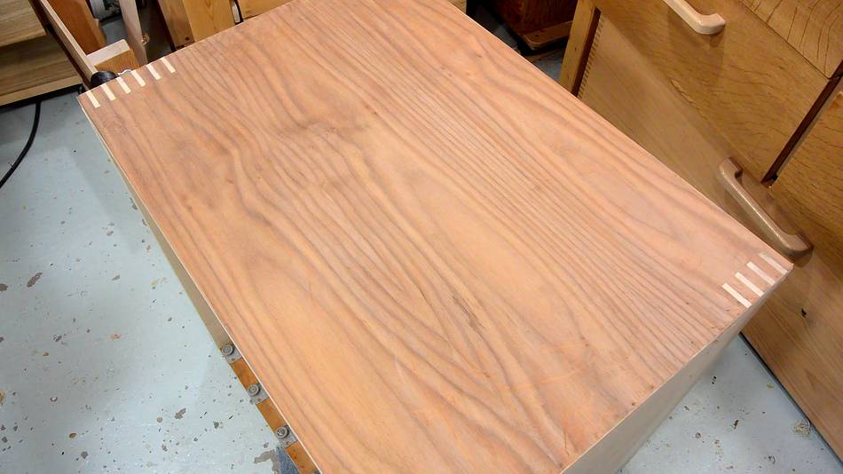 The drawer front has a rabbet cut on the bottom side so that the plywood