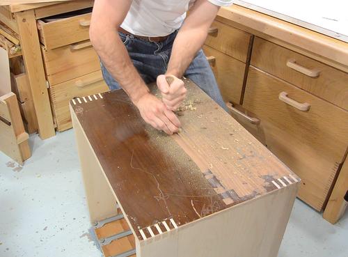 Next I tackled the finish on the cabinet sides. Here, scraping