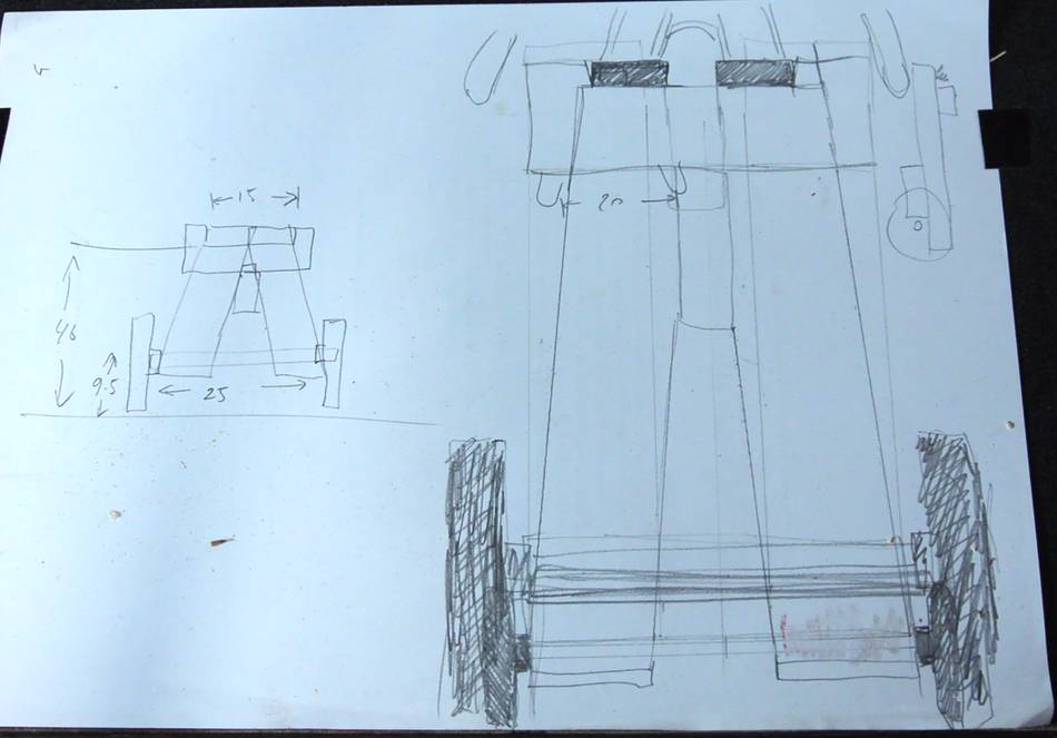 I sketched out a design (left, at left), and rummaged around for suitable wheels