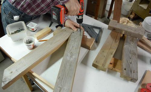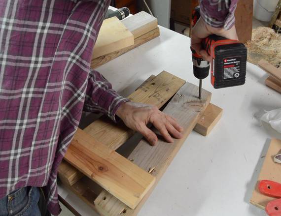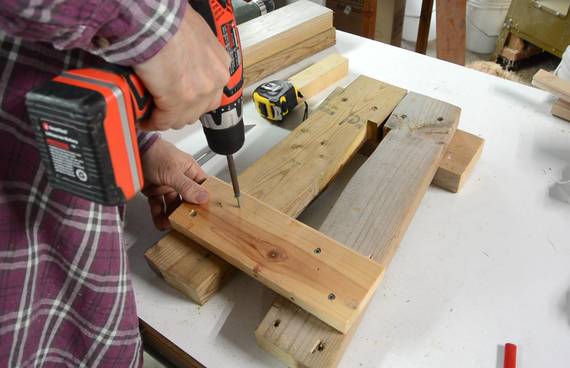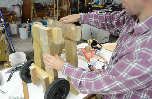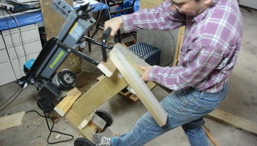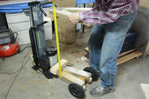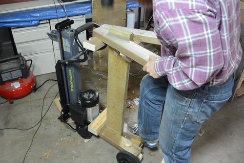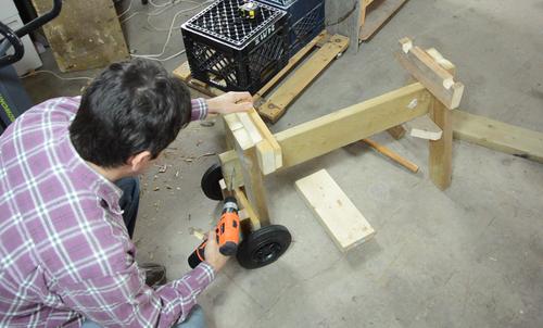 Screwing the 2x6 onto the wheeled end of the stand. I also added another brace