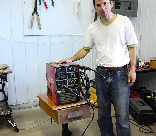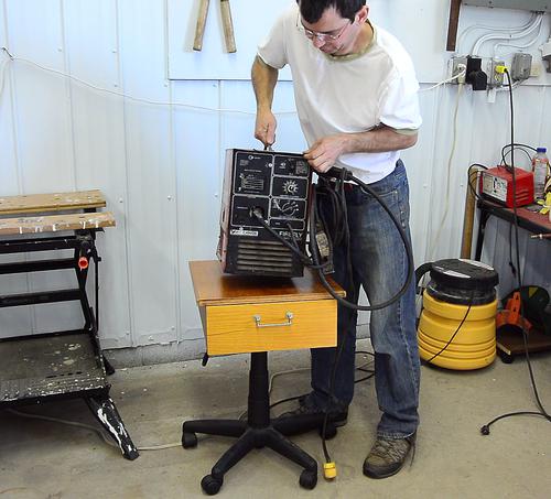I have since built a workbench on wheels that now holds the welder. I just wheel the whole workbench outside for stuff like welding that makes lots of smoke.