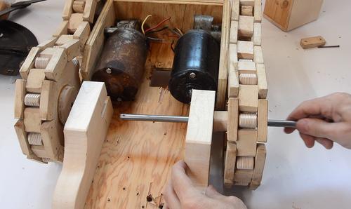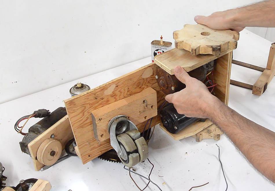 Each of the two cogged wheels is powered independently by a windshield wiper