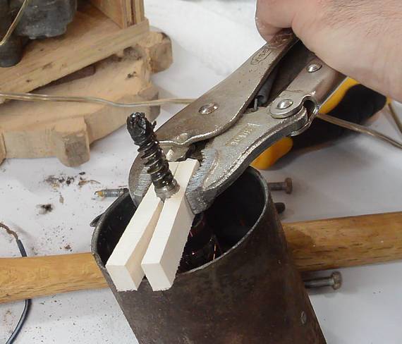 The rotor was stuck in the back housing. I cut two pieces of wood to clamp