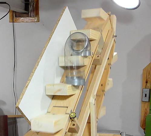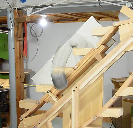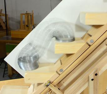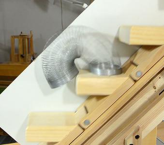 I never got the machine to be terribly reliable. Getting the slinky to descend 100 steps without falling off or starting to tumble is always an accomplishment, like getting a high score in a game, except that I have no control once the slinky is launched.