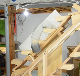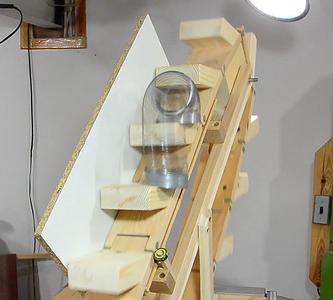 The slinky machine - followupIt was my friend Eric Andrasi (who helped me shoot the air gun video) who originally came up with the slinky machine idea years ago. We talked about it over lunch from time to time, and I always teased him for not having built it yet. Eventually I concluded he'd never get around to building it, so it's fair game for me to build it. The original idea was to also motorize it and add some speed control to make sure the machine runs at the same speed as the slinky. Eric's idea had been to have electrical contacts on the steps, and some sort of commutating setup to get the connection from the steps back to the base to determine where the slinky is for speed control. I always figured the electrical contacts would be too unreliable, and optical was the way to go. But once I built the slinky machine escalator, I realized that keeping the slinky descending reliably was a much bigger challenge than anticipated. A straight run of 30 steps is already a challenge, so there's no point in automating it. Besides, if the machine is running and there's no one there to watch it, what's the point? And if someone is watching, that someone might as well be turning the crank.