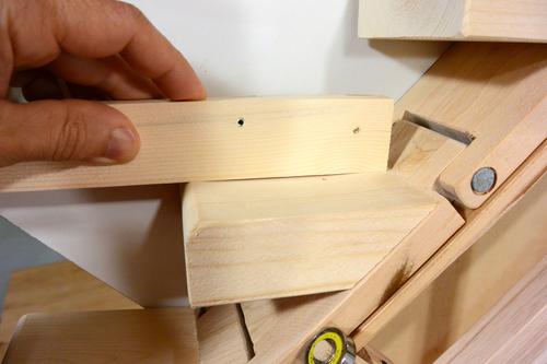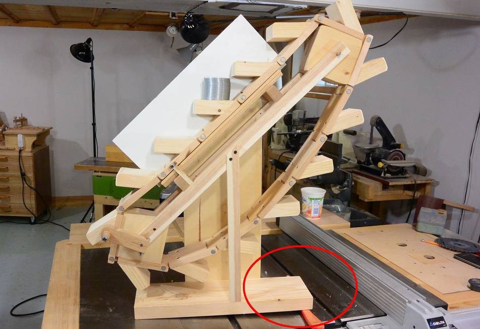 The whole thing is very much a prototype / experiment. In fact, I also made the mistake of drilling the holes for the nails too big, so they fall out if the machine is laid on its side. But between the backer board on the back and the guide bearing on the front, the nails keep getting pushed back in as the chain goes around. If I was building it again, I'd make the steps 11 cm vertical and horizontal and also a bit wider. But if I made the steps bigger the whole machine would be even bigger. I prefer my useless creations to be easyer to store. But it's these novel but useless contraptions that get people interested. If I build a dresser, that's very practical and useful, but it doesn't get the sort of attention that a jenga pistol or marble machine will get.