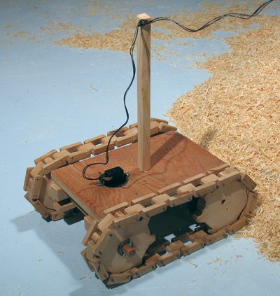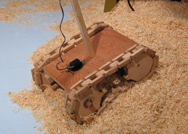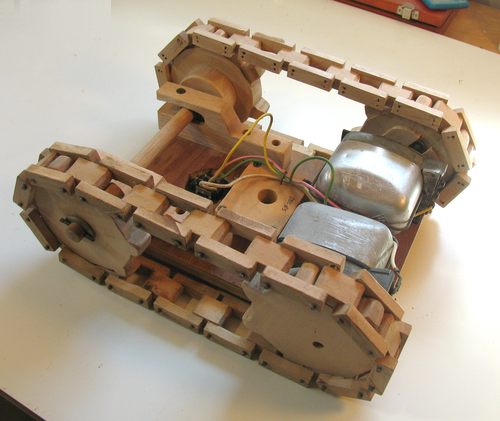 This little tank thread vehicle I built more or less as an experiment back in 1985. I had been experimenting with wooden chains, and so decided to try a block chain made out of maple as a tank thread.