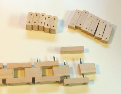 Once the nail is driven through the blocks, the sharp ends of the nails are cut off. Its really quite a simple process, although it does get a bit tedious to make for longer chains.