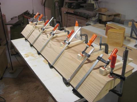 I made these temporary cauls with a 45 degree hook on the end. I clamped those onto my horizontal board with C-clamps. The hook on the ends of the calls then provided a nice spot for my bar clamps to clamp against.