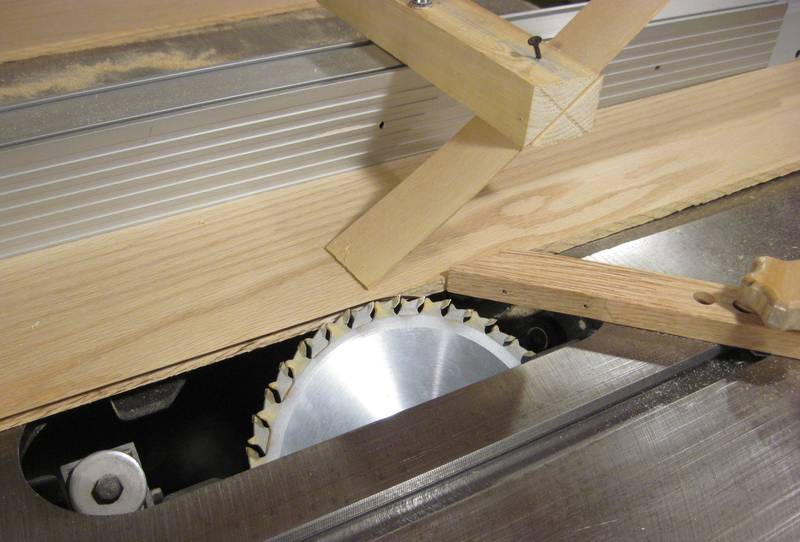 Turns out, my dado insert didn't have the right kind of clearance for this kind of cut. And rather than make a dedicated insert, I went ahead and made the cut without one. Getting the board exactly aligned and up against the fence and table for the whole cut was critical. So I used my featherboard, and attached another piece of wood to the top of my rip fence (which, luckily, has two T-slots in the top, so I could attach something to it) to act sort of like a featherboard from the top.