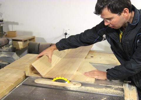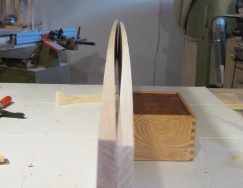 I bought some 5/4" (3 cm) thick oak boards and resawed them on my homemade bandsaw. First I tried my newer homemade bandsaw, but the 1/2 HP motor on that saw just wasn't enough to cut through 20 cm (8") of dry oak. But my first homemade bandsaw, with it's powerful 1.5 HP motor, and a new blade cut through it like butter.