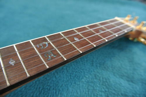 If you look very closely at the mother of pearl inlays on Pat's, you can see that he routed slightly outside the letter shape in places, though the stained epoxy hides that fairly well. But that's a minor imperfection, and the only imperfection I could spot on the whole instrument.