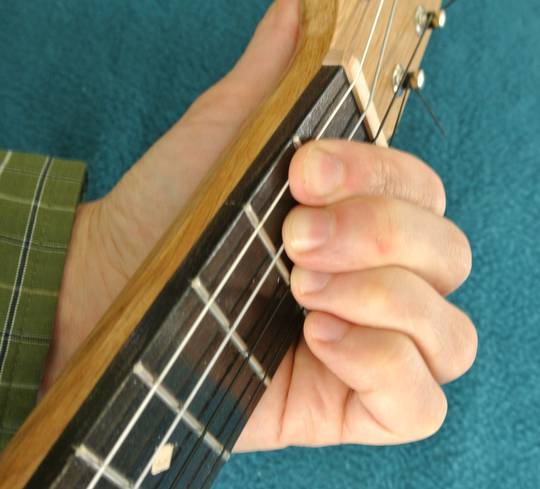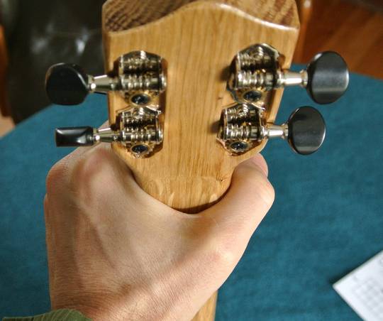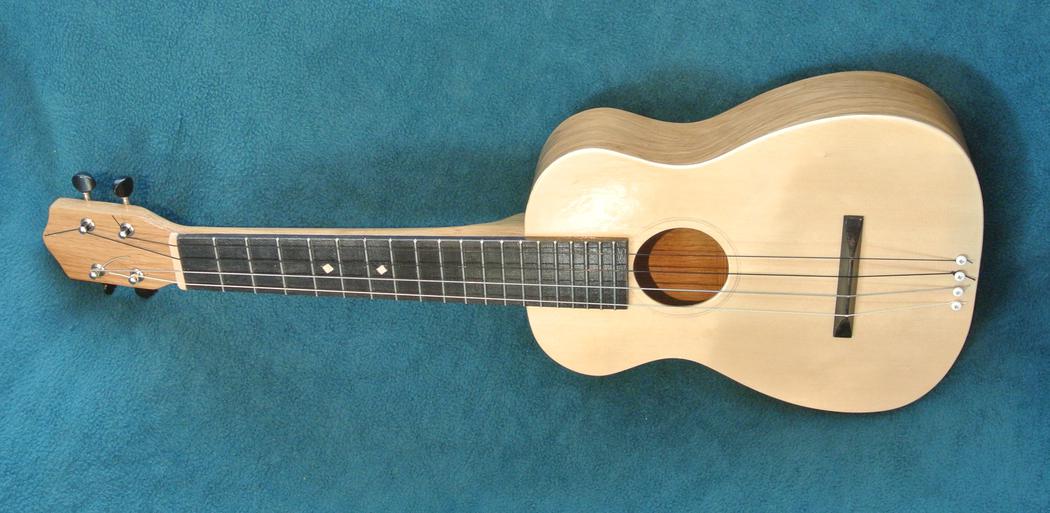 I figured the back of a guitar or ukulele contributed very little to the sound, but on the one Pat built, pressing the back of the instrument against the skin noticeably dampens the sound. So I guess the back matters more than I thought it did. On mine, the effect is less noticeable. The back of mine is 2.5 mm thick and made of heavier white oak, so it doesn't vibrate as much.
