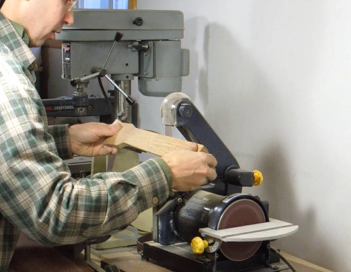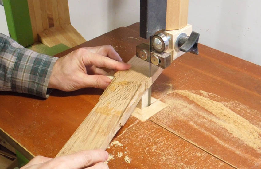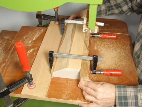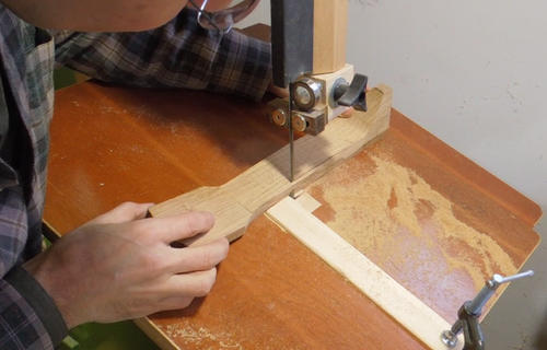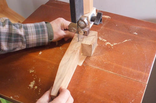 Now cutting the transition from the head to the neck on the bandsaw. I put a block of wood under