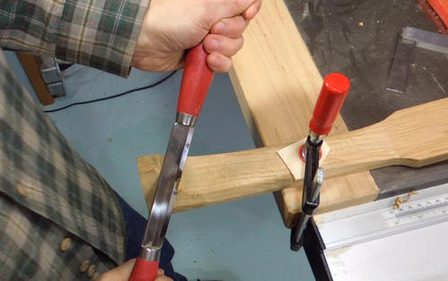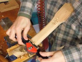 Finally, cutting a chamfer along the edges of the neck. I clamped a strip of wood