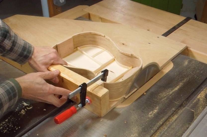 Guitar makers typically have a jig for cutting the scarf joint on the table saw.