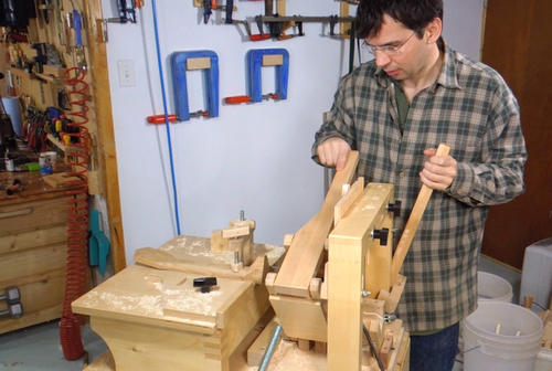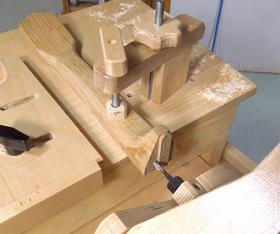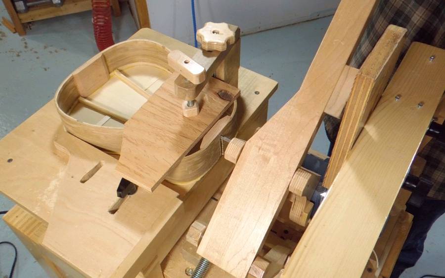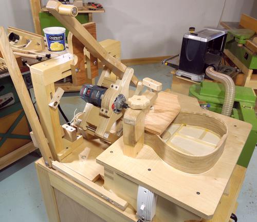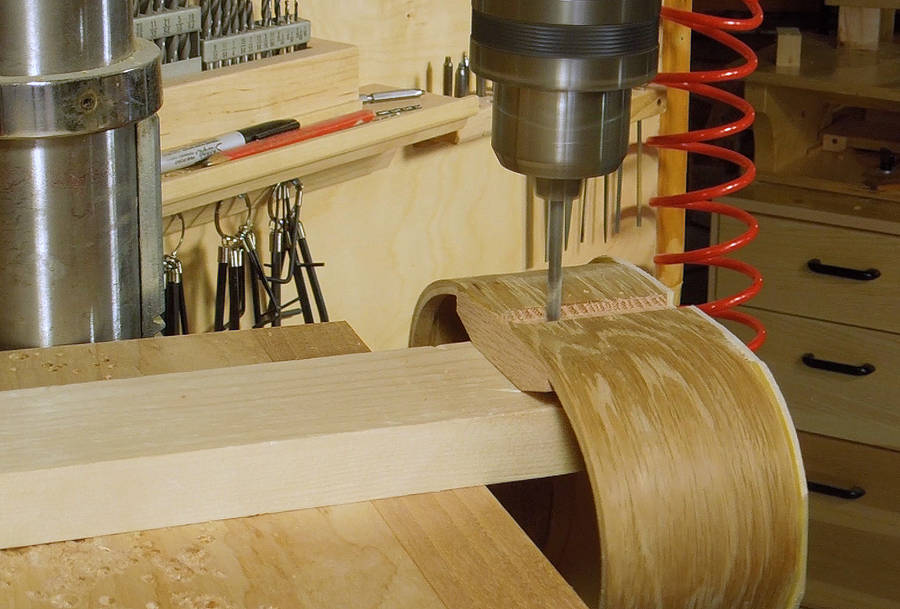 A complicated jig-up to drill the holes in the neck. A hand drill would have