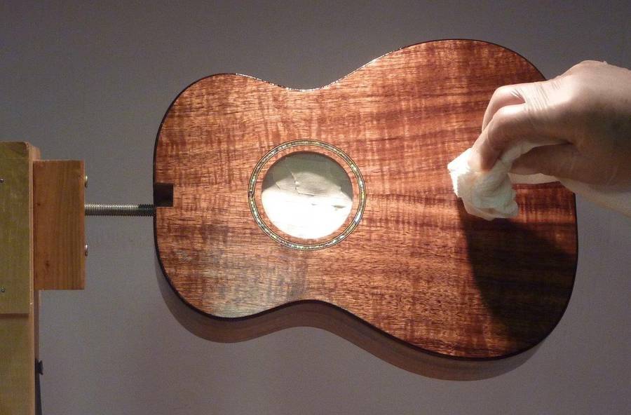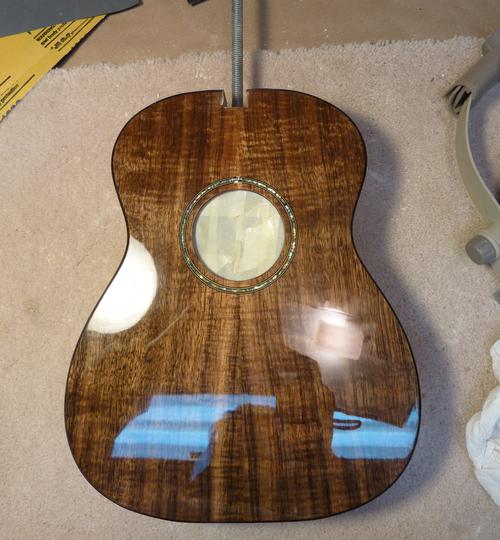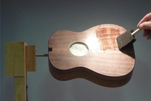 The ideal finish for a guitar would be ultra thin, flexible, perfectly clear, resistant to all chemicals, including body sweat, and able to stop bullets. In my quest to find such a finish I have tried nitrocellulose lacquer, various water based lacquers, varnish, shellac and, ultimately, UV cured polyester. I have found the finish that comes closest to ideal is the UV cured polyester and that's what I have been using for a couple of years, along with shellac for those that want a French polished finish. There's been quite a learning curve with the polyester finish and I have to say it's still a love/hate relationship I have with the stuff.