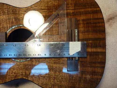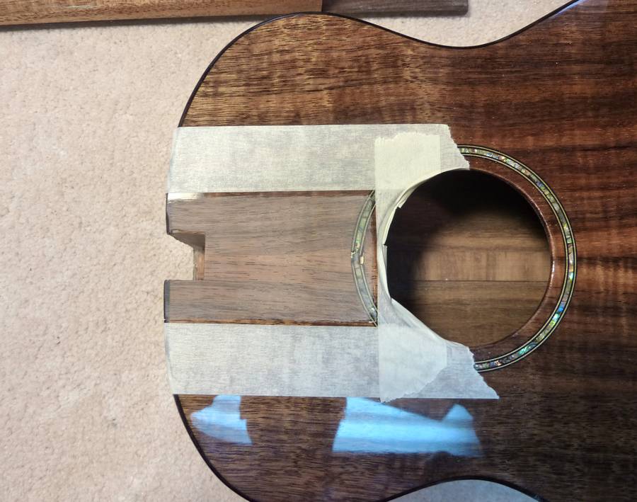 Readers may be surprised to learn that I glue the bridge right to the finish using medium CA glue. This was a tip I learned on a guitar forum from Rick Turner, a well respected builder in California. I must admit to a little trepidation the first time I tried this, but I have since done this on several guitars with no issues. I don't know if it would work with other finishes, but CA certainly sticks wood very well to polyester!