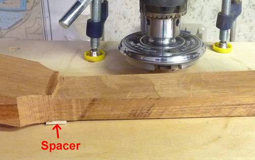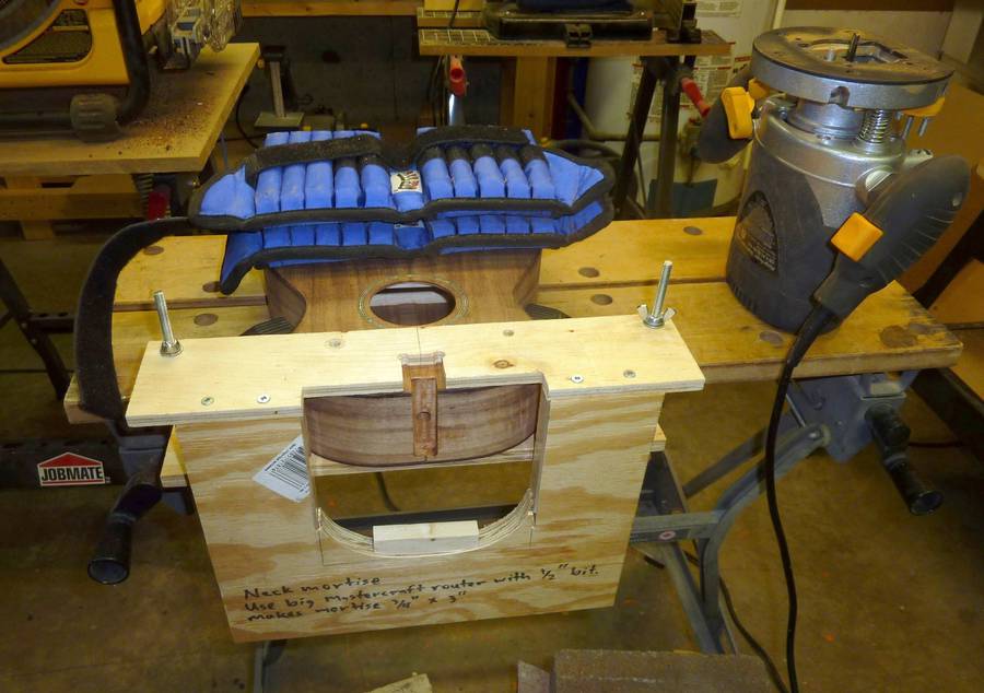 Pat Hawley writes:The simple jig I use for doing the neck mortise. The router base slides directly against the ukulele's body. It's the same one I use for guitars except I use a smaller bit and put a stop at the bottom to end up with a smaller mortise.