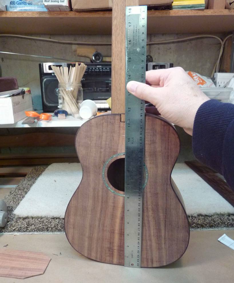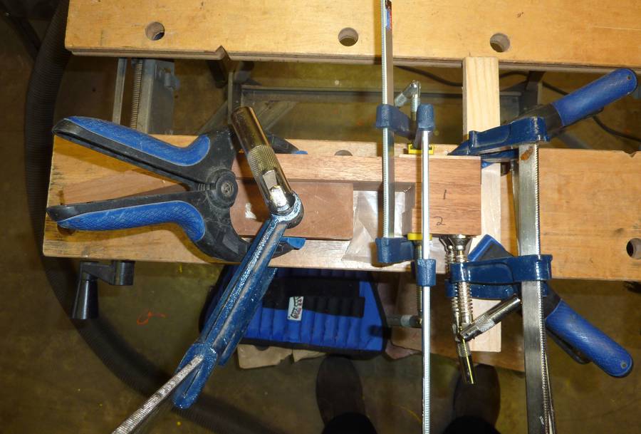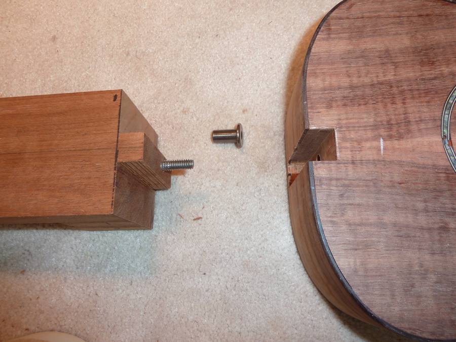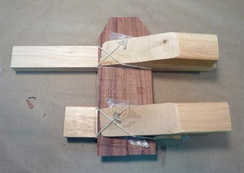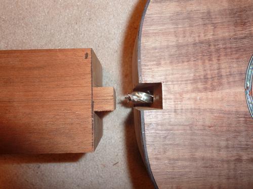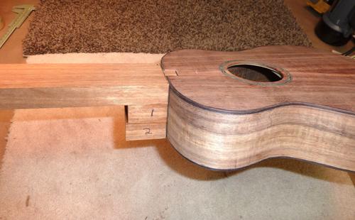 Here is gluing the neck block on (pieces marked 1 and 2). The other block of wood to the left is used to help hold the neck in place (not glued on).