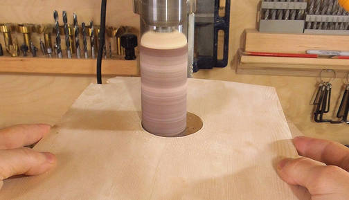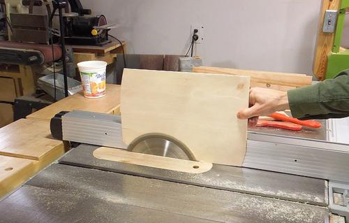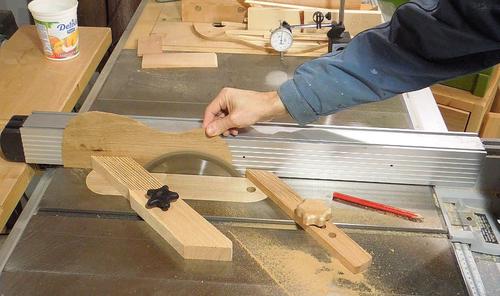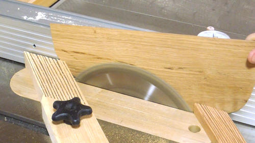 I initially pushed the piece with my push sticks, but found I often slipped off the workpiece with them. Wherever I stopped even briefly, the spinning blade caused burn marks on the wood.