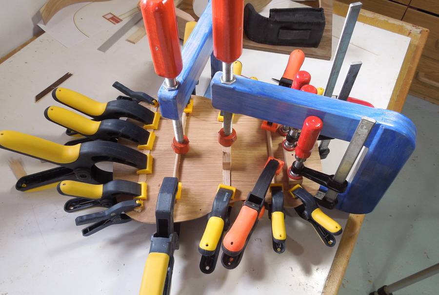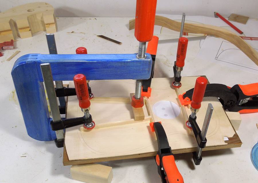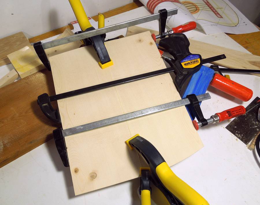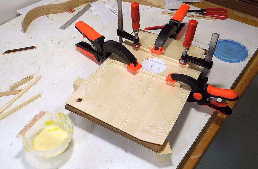 I put the sound board on a piece of plywood, then used clamps to press the ribs onto the