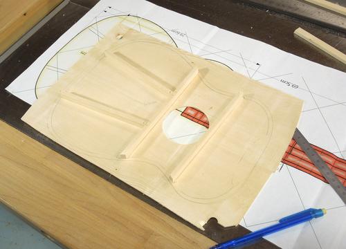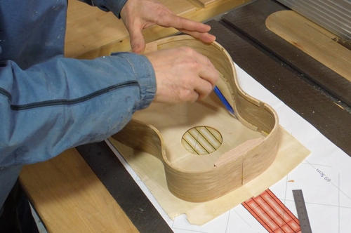 With the sound hole cut out, I used my 1:1 printout to locate where the body fits on the
