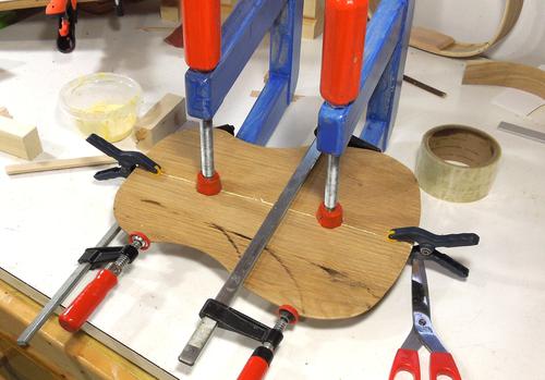 This sort of job just screams "build a jig", but I'm not planning on getting into guitar building, so I wouldn't have much use for such a jig after this build. I didn't at the time know the trick of using strings and cauls, like Pat Hawley uses , although that trick seems a bit awkward too.