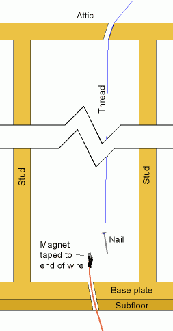 My method of using a piece of metal and a magnet has served me well though, and once I gave up on the fish tape and used a magnet, it worked for me quickly. For this type of job, I have also seen suggestions of dropping a chain in from the top, and hooking it in from the bottom. I'm very skeptical of that method myself - I can't imagine the chain not getting caught or jammed as you try to hook it somewhere from below, unless you drill a really big hole. Basically, my method consists of attaching a small rare earth magnet to the end of a piece of copper wire or coathanger wire, and passing it up from below, so that the magnet is a few centimeters into the stud cavity. Then, from above, lower a nail or other narrow piece of metal attached to a thread. As you first lower the nail, be sure that it pulls in an amount of string that corresponds to the height of the wall. If the nail hits something before going down the full wall height, there's likely some sort of cross brace or fire stop in the wall. If jerking the string repeatedly doesn't make it go down further, pick a different spot to run the wire, or resort to cutting a hole in the wall at the height of the obstruction to get around it. Once your have lowered the nail all the way down, bounce it around the bottom of the cavity by repeatedly jerking the string up and down a little bit, until you feel resistance to pulling the nail up, at which point it should be stuck to the magnet.
