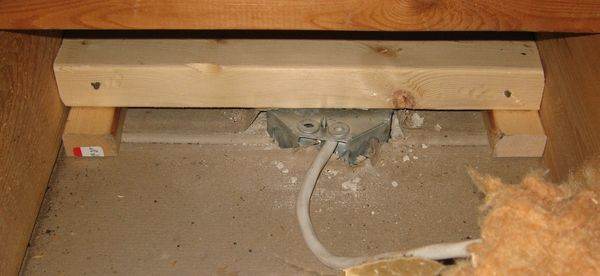 To subsequently mount the socket, I cut a piece of 2x4 to the length of the space between the joists. Two small blocks on either end lift it to the right height for the octagonal socket to be flush with the ceiling. I nailed this piece of 2x4 in with diagonal nails on either end. The two little blocks are not actually attached - just made them to help me position the piece of 2x4.