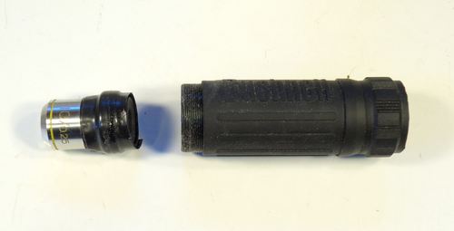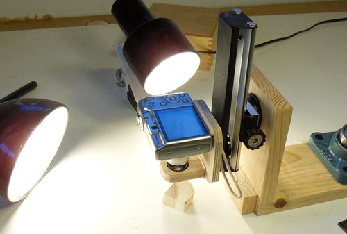 Microscope eyepieces are designed to have an image projected into them by the microscope objective lens. The projected image is then turned into a far-field virtual image by the eyepiece, so that the eye can see it clearly. As it turns out, binocular eyepieces are designed to do just that as well. So I took a perfectly good pair of compact Bushnell 8x24 binoculars and used the barrel and eyepiece with my microscope objective lens. I didn't completely waste the binoculars though. It turns out that half of the binoculars functions as a pretty decent monocular on its own. The binocular barrel also had an inverter prism in it, which also helped. Otherwise, with the optical path that I had, my image would have been upside-down. Upside-down would not have mattered much for the photos, but its very hard to orient and move around an image when the image is inverted. Normal optical microscopes also have inverting prisms in their optical path. The setup with the binocular barrel and eyepiece produced about 5x as much magnification as I got with the 35 mm camera lens, but it was much harder to get sharp images. My depth of field was becoming very limited. Depth of field can be increased by using a smaller aperture, but that reduces the amount of light, and can also cause blur due to diffraction. I was starting to approach the limits for magnifying opaque objects with reflected light.