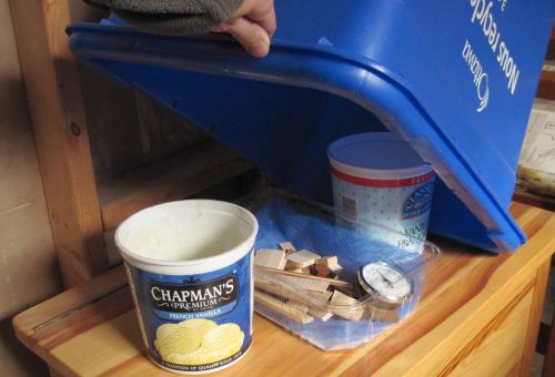 the container of samples under a recycling box, with two ice cream containers