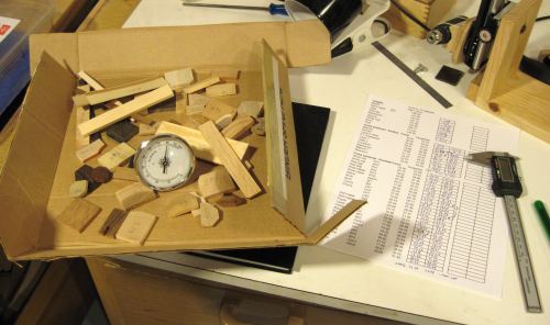 I cut samples from numerous species of wood. I cut slices off the end of the pieces of wood, so that my sample pieces were only about 5 mm long in the direction of the grain. Moisture travels best along the direction of the grain. With my slices this thin, and with some experimenting, I figured that about three days was enough for the wood to reach equilibrium with a new level of ambient humidity.
