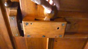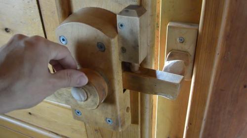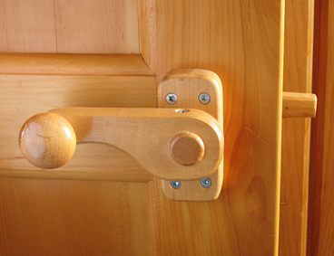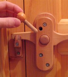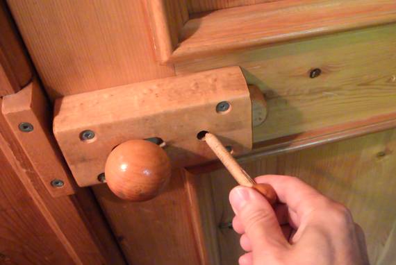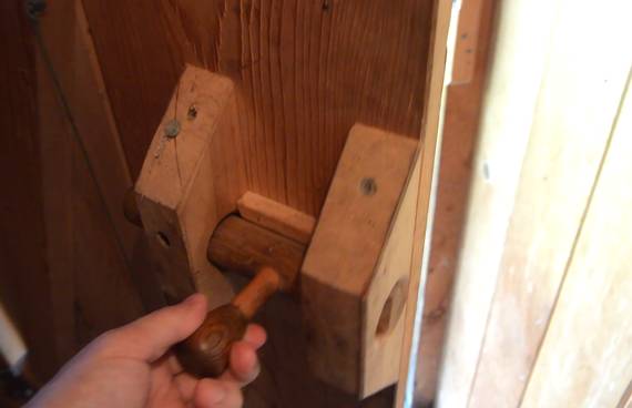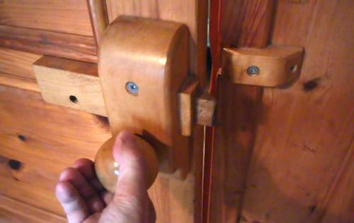 on to pull the wooden bolt back. The bolt is spring loaded, so the door can actually