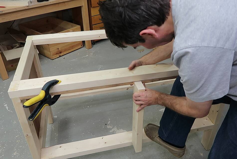 I thought about using a similar set of six mortise and tenon joints as I did for the T-joints for the legs, but I figured cutting away so much of the material for the mortises would weaken the strength of the horizontal members. I had no such worry about cutting all the mortises into the legs because the legs aren't getting the same sort of bending load as the horizontal members are.