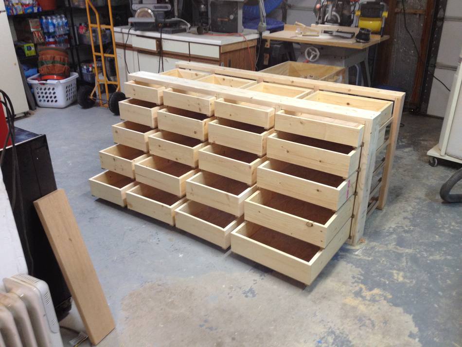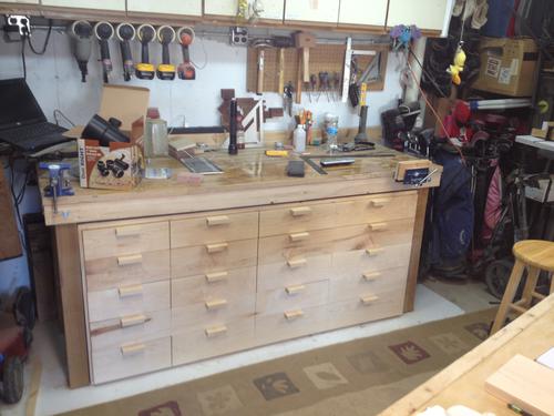 "Hello Matthias, Hope the winter is not too bad in Canada, but having been up in Montreal in December, I know it's pretty cold where you are! Using your basic design, I built the set shown in the attached. The supports and the runners for the drawers were made from the same piece of wood - kind of a neat feature. Plus, the support was 'L' shaped so it keeps the drawer lined up. The faceplates are maple. Thanks for the inspiration!"