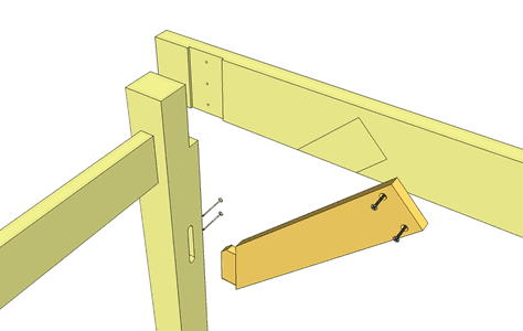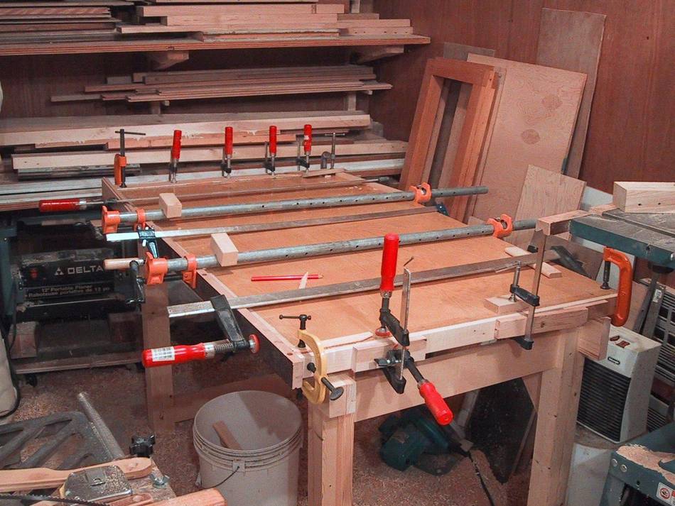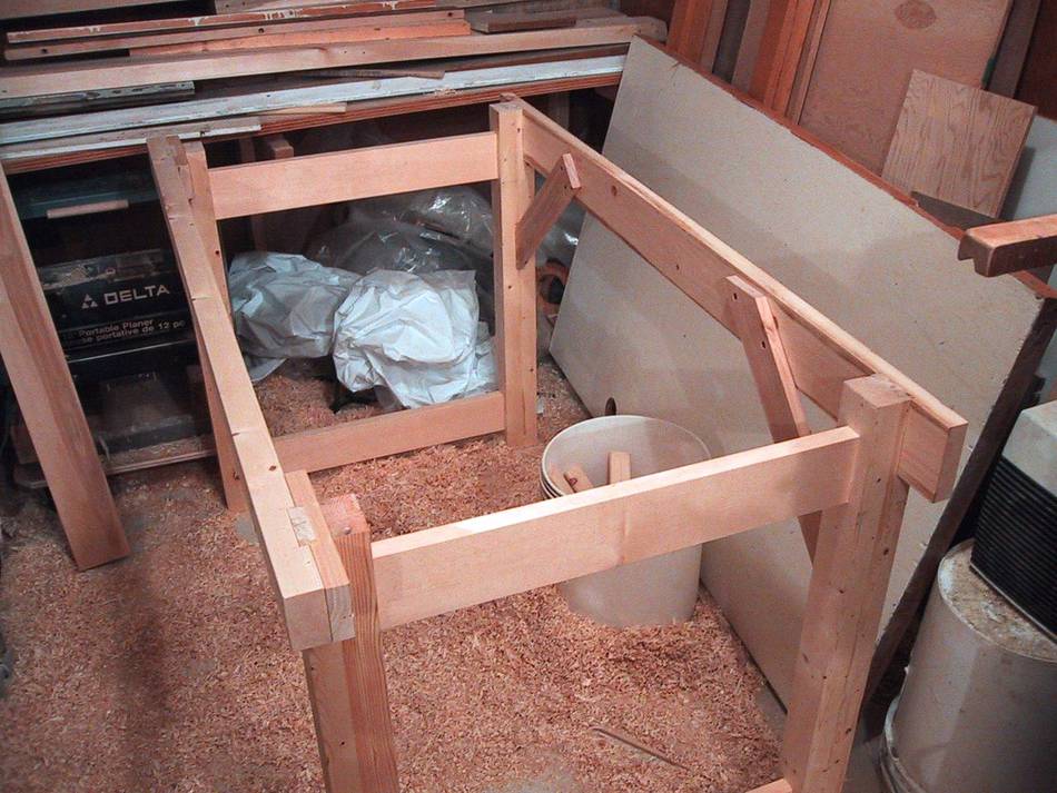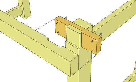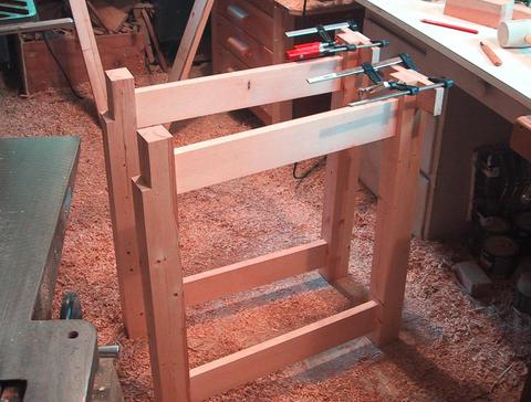 In this photo, I had just glued the hardwood blocks into the front legs of the two side frames. The clamps help ensure the joint is tight.