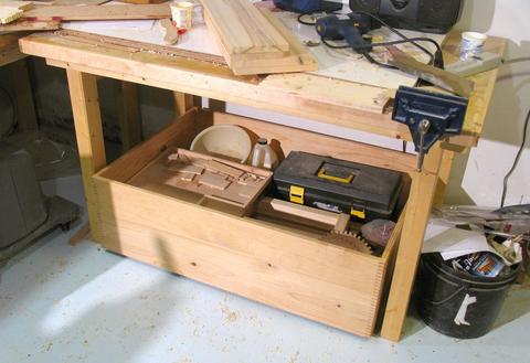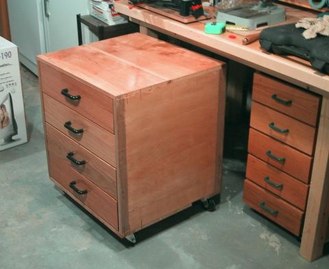With the workbench conveniently open at the bottom, I made some rolling storage units that just fit under the workbench.