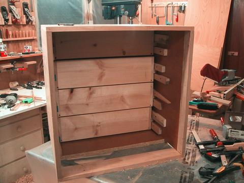 I had just built my screw advance box joint jig, so all the corners for the drawers are box joined. I also explored some ways of doing the front corners of drawers with box joints