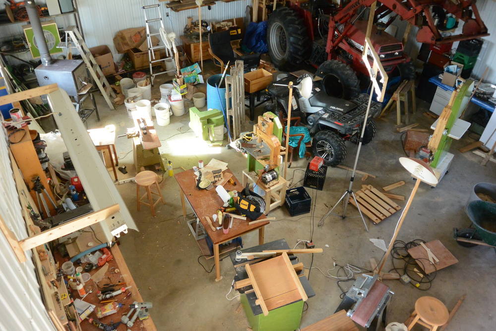 small area dedicated to woodworking. The back left corner has the wood stove in it,