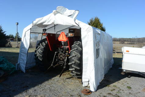 I obtained a car tent, which was just barely big enough to park the tractor in with the muffler removed and no bucket on the front end loader, though I had to duck while driving it in.