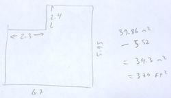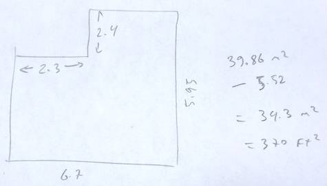 The shop is 34.3 m2, or 370 ft2. Though it often seemed too small, realistically, as long as I moved the machines I was no longer using out of the shop, it was always enough room for my projects. The largest thing I built in the shop was parts of my shed, a queen size bed, and another one earlier