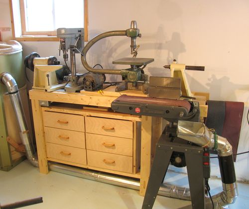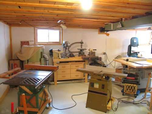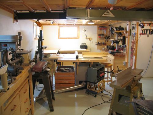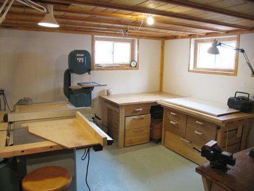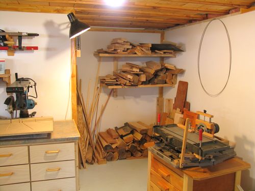 This is the area where I spend most of my time in the workshop. The bandsaw is also near there, as I use it quite frequently too. It's up against the wall, and for those times that I need to cut long pieces on it, I just pull it towards the middle of the room. It's on a mobile base, so this is easy to do.