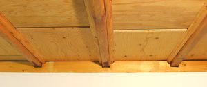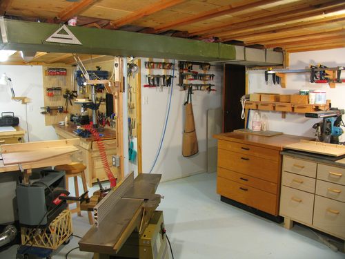 I should also point out the novel design of the ceiling in my workshop. My house is a bungalow from the 1950s, with a relatively low basement ceiling. The way the ceiling is done is that somebody planed and routed the bottom edges of the joists, and then attached molding to either side, and put plywood panels in between. It must have been very labour intensive, but the result is that most of the ceiling is about 2 cm higher up than the bottom edge of the joists, so a little bit of height is gained back in the basement. The panels are in loose, so I can still get in there if I need to do some rewiring.