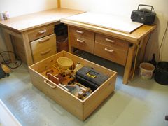 The bottommost drawers under both of these workbenches are actually drawers rolling on rollerblade wheels, very similar my under bed drawers. The large one at right is especially handy for holding bulky items. It's sturdy enough for me to stand in the middle of it.