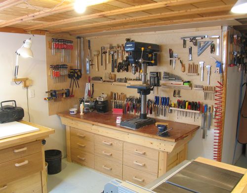 The drill press is a tool I use an awful lot, and the most frequently used drills are nearest to the drill press. Other, less frequently used tools are in the workbench drawers right under the workbench.